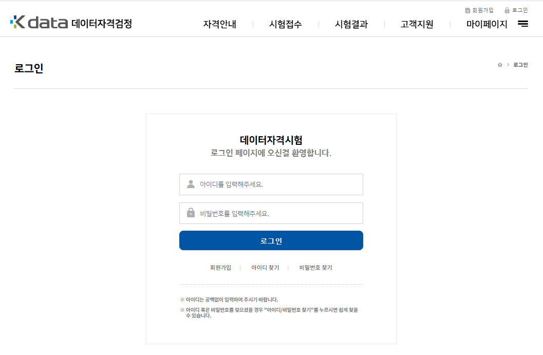 2. 데이터 자격검증 사이트에서 로그인 진행.